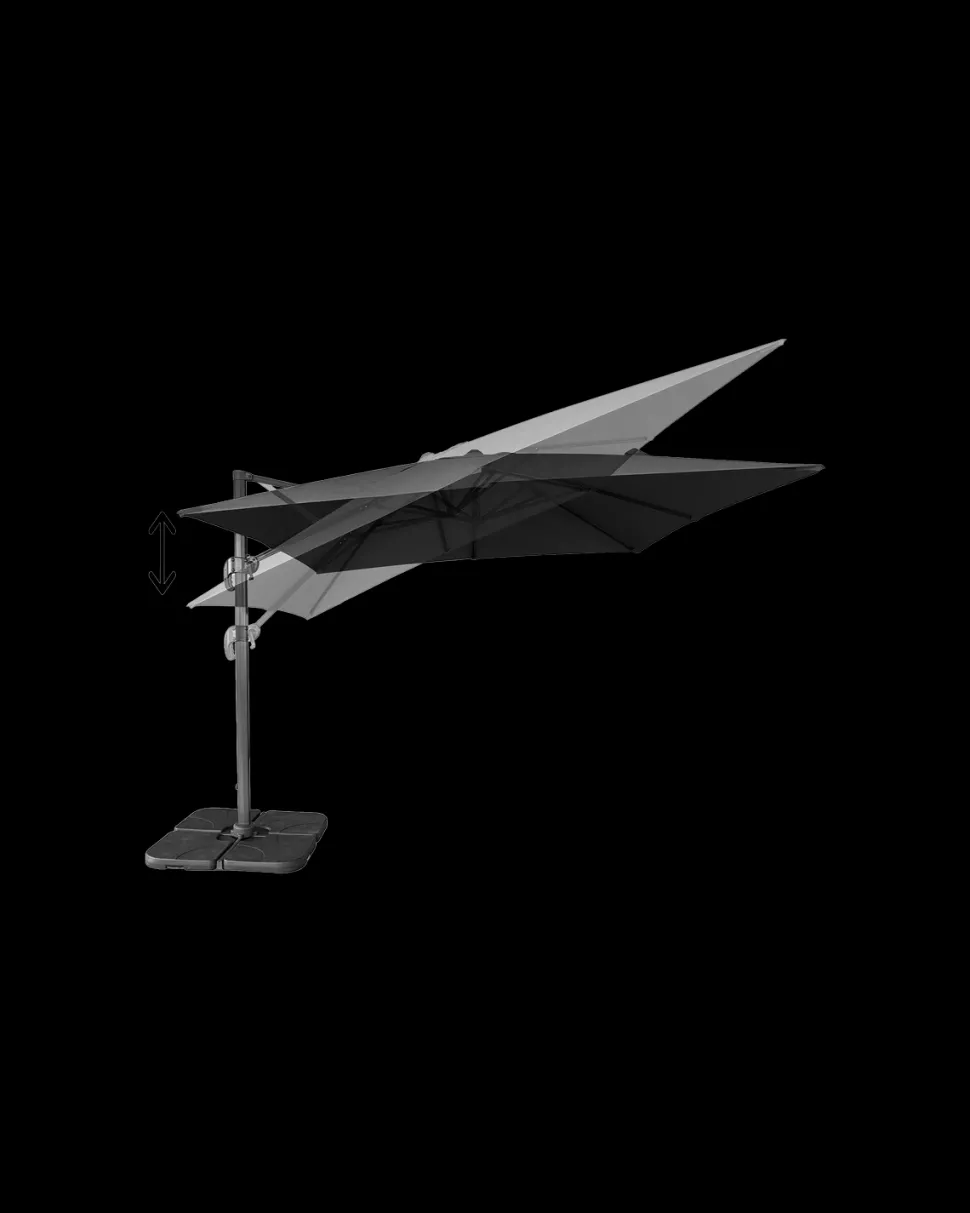 Baza hængeparasol i sort med stor skærm 295×295 cm. Parasol med grå aluminiumsstok, tilt-funktion og parasolfod inkluderet.