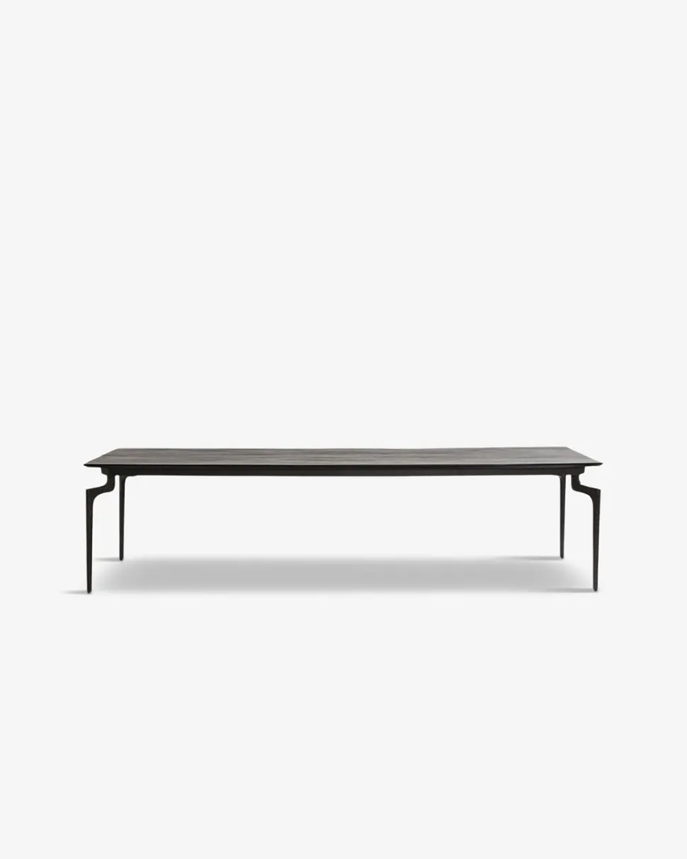 Stellets design, sammen med bordkantens skrå profil, gør at bordet får et let udseende, selvom det er i XXL størrelse.