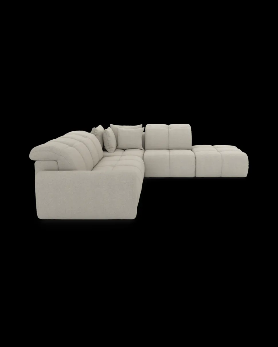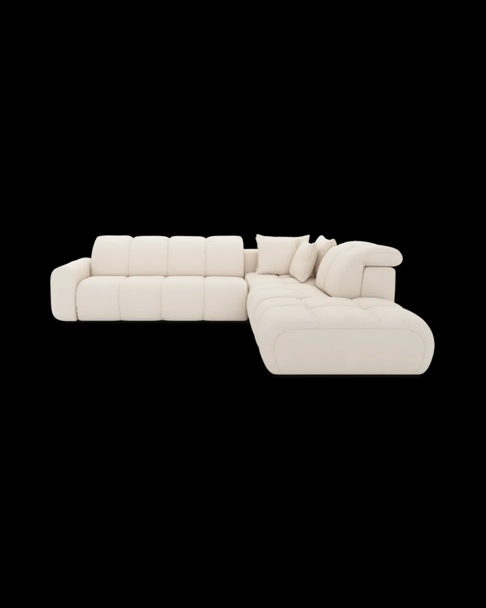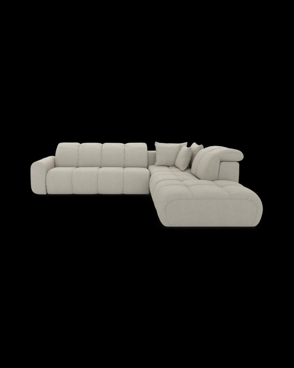 Bullet hjørnesofa med rundt hjørne og open end. Puffet design med justerbare nakkepuder og høj komfort