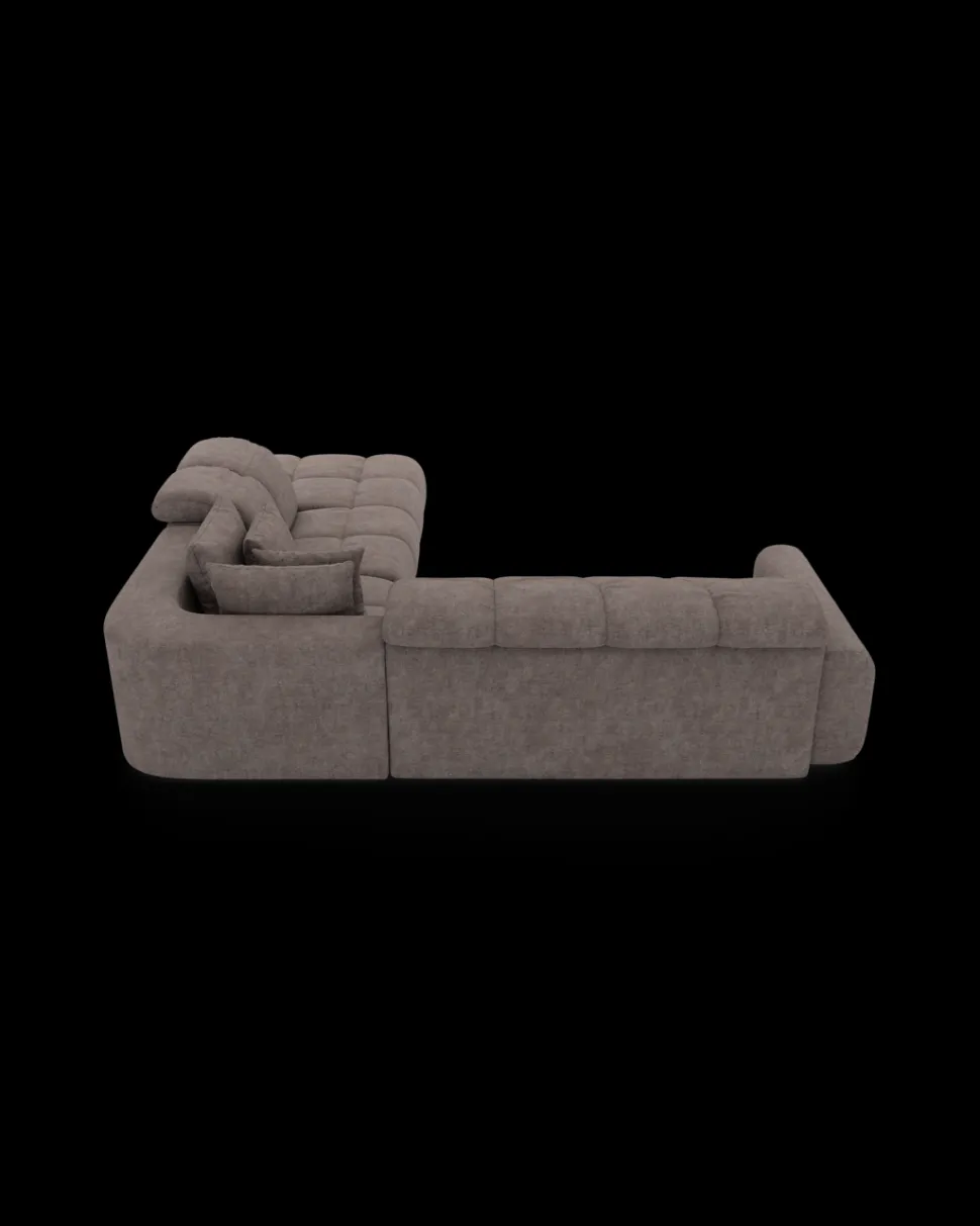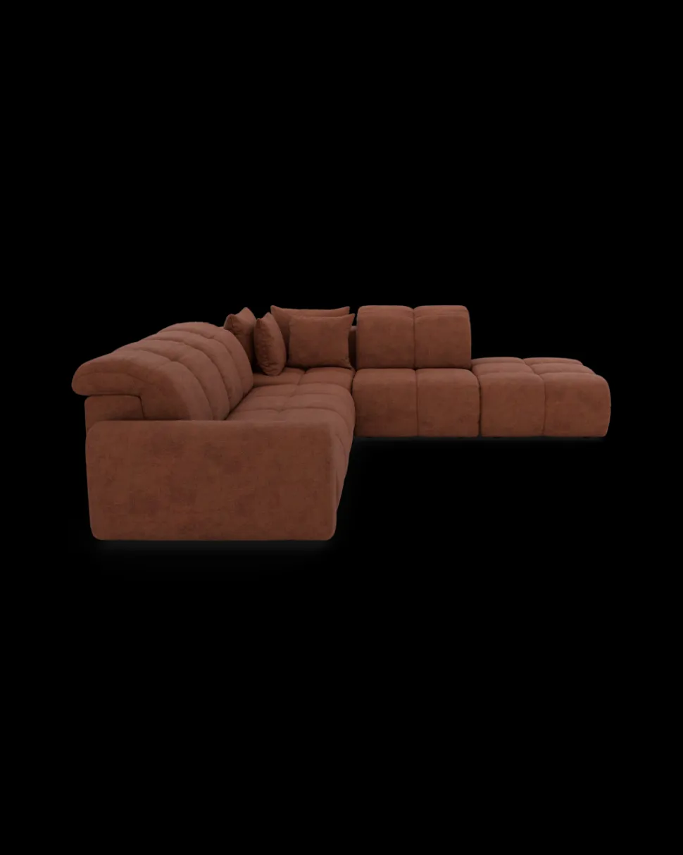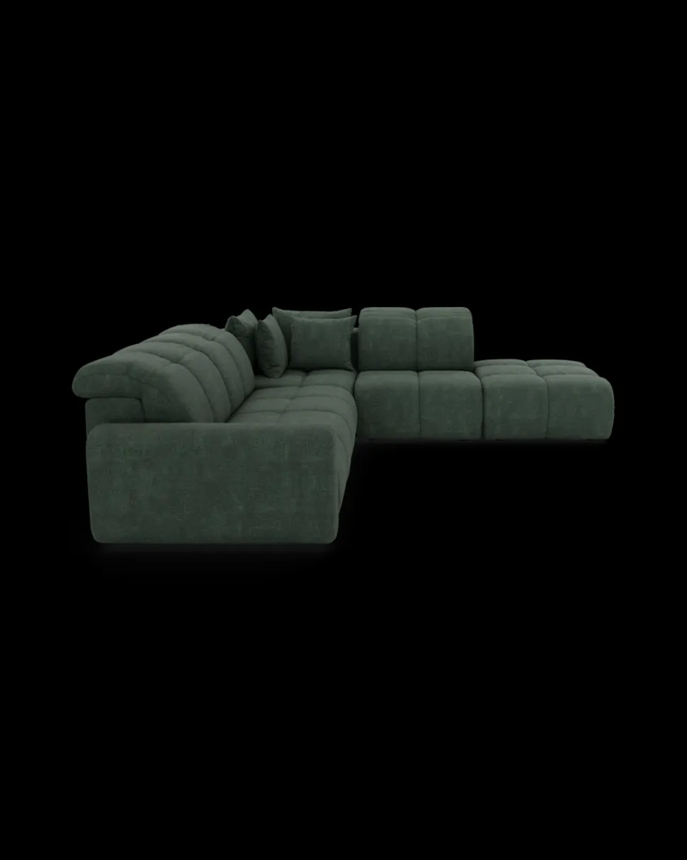 Bullet hjørnesofa med rundt hjørne og open end. Puffet design med justerbare nakkepuder og høj komfort