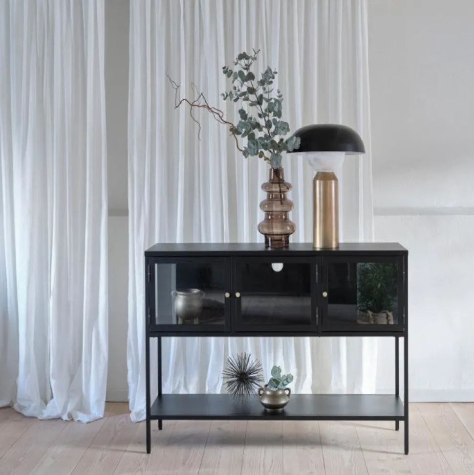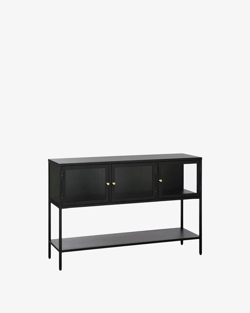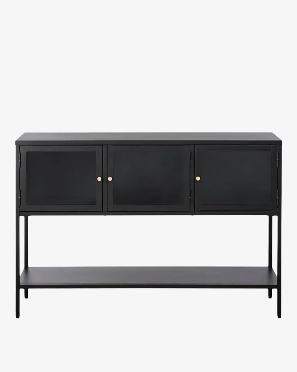 Carmel konsolbord er et moderne og unikt konsolbord i sort med tre glaslåger, og en ekstra hylde nederst.