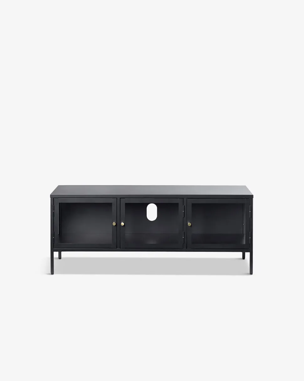 Carmel TV-bordet er en smuk kombination af rå metal med et industrielt udtryk, og det fine glas i både siderne og lågerne, der sammen giver et rigtig flot udtryk.