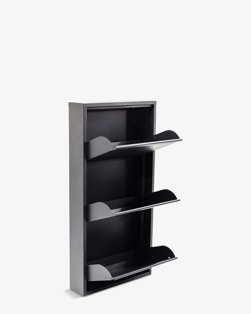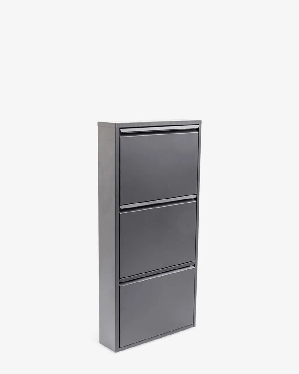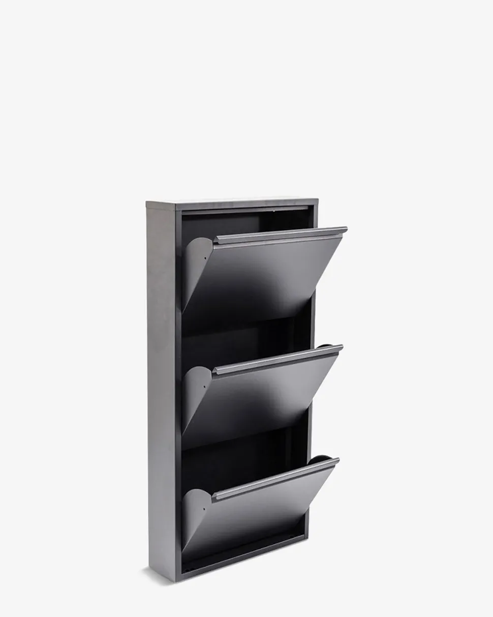 Caruso Skoskab i pulverlakeret stålplade med attraktiv lakering i antracit. Et meget stilrent og elegant møbel til entréen.