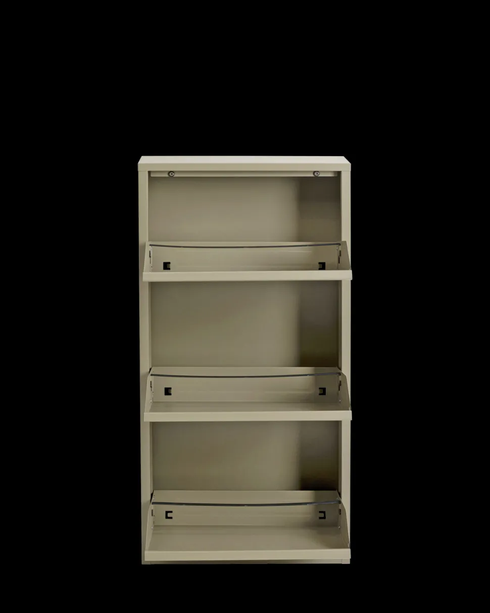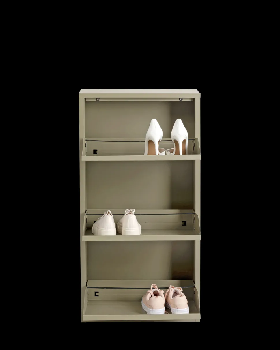Caruso skoskab – 3 låger i khaki. Kompakt metal skoskab til entréen.