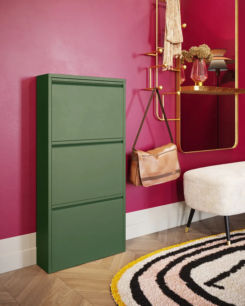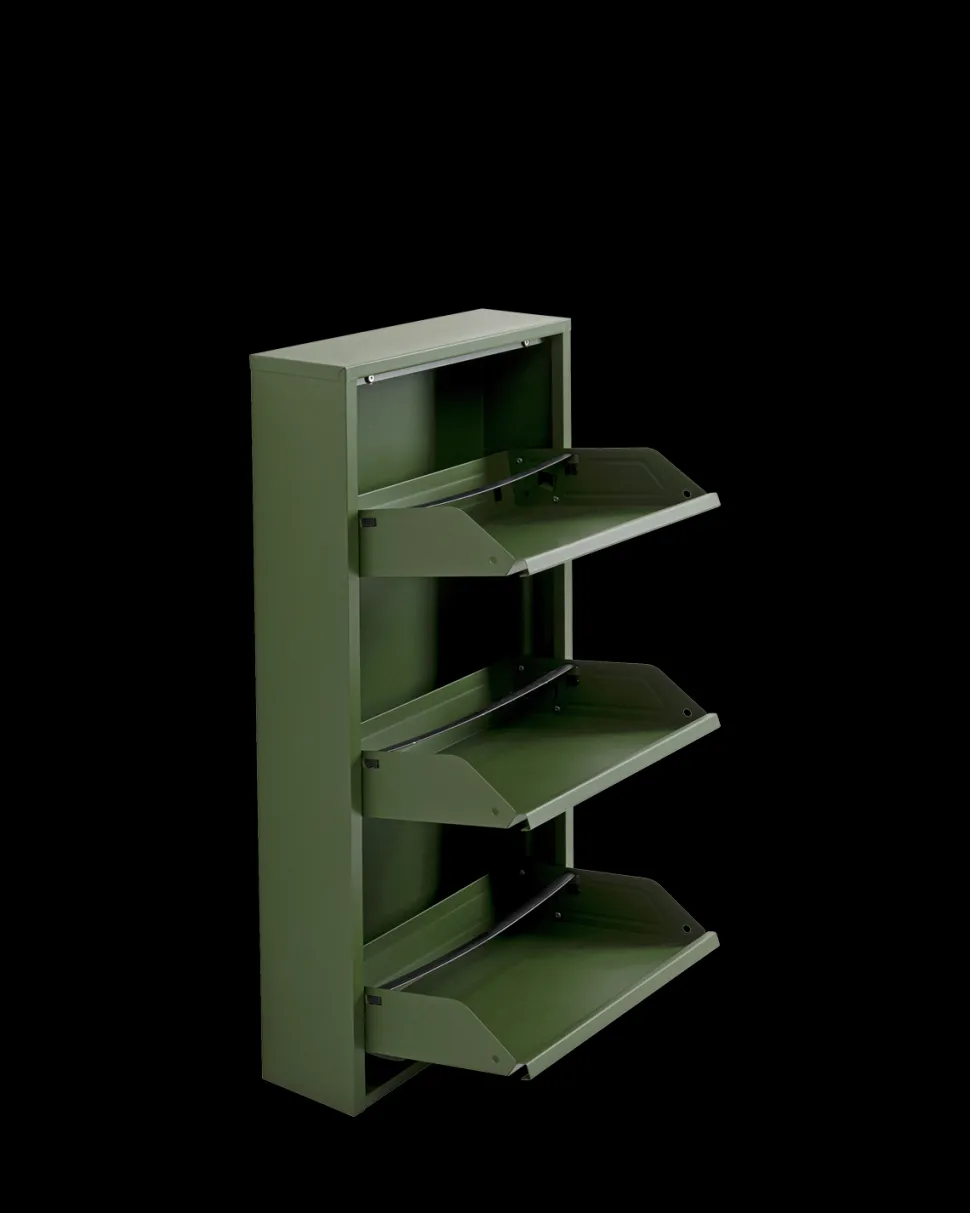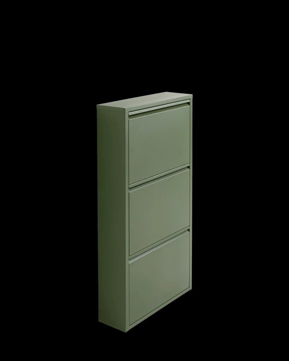 Med 3 låger får du god plads til skoene i et kompakt format, og den olivengrønne farve giver et roligt og tidløst udtryk, der passer ind i mange hjem.