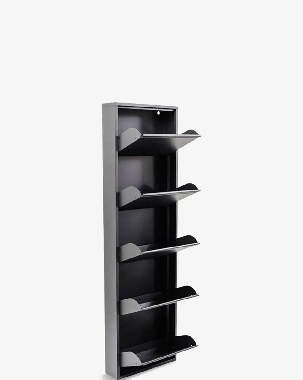 Caruso Skoskab i pulverlakeret stålplade og lakering i antracit. Et meget stilrent og pladsbesparende møbel.