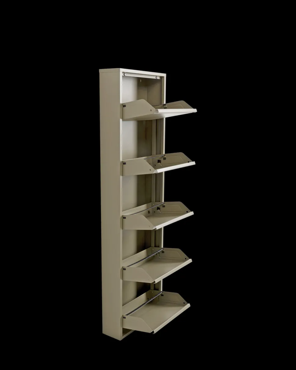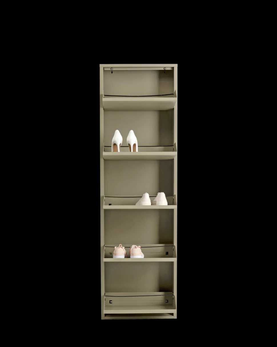 Caruso skoskab – 5 låger i khaki. Slankt metal skoskab til entréen.