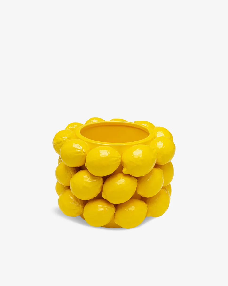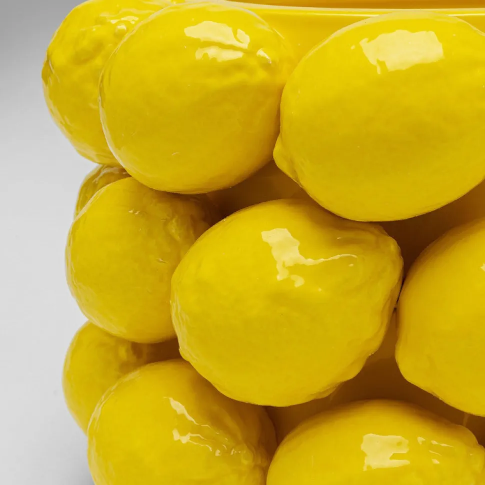 Flot og dekorativ vase i keramik med vellignende gule citroner, som vil skabe farve og liv i din indretning.