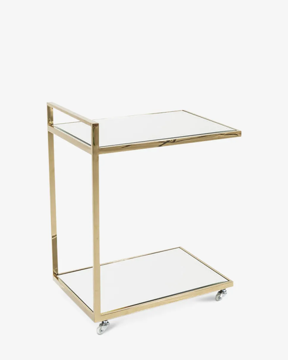 Dette flotte og enkle rullebord er udført i rustfrit stål der er lakeret så det minder om guld og med en glasspejl plade som bordplade.