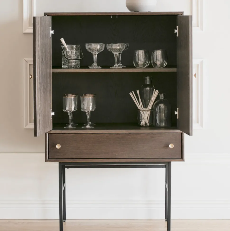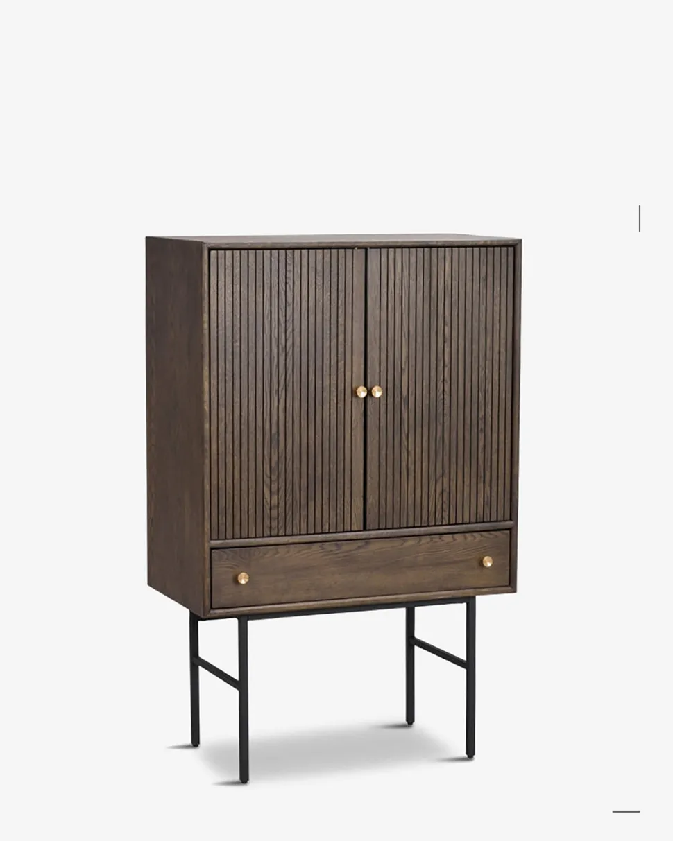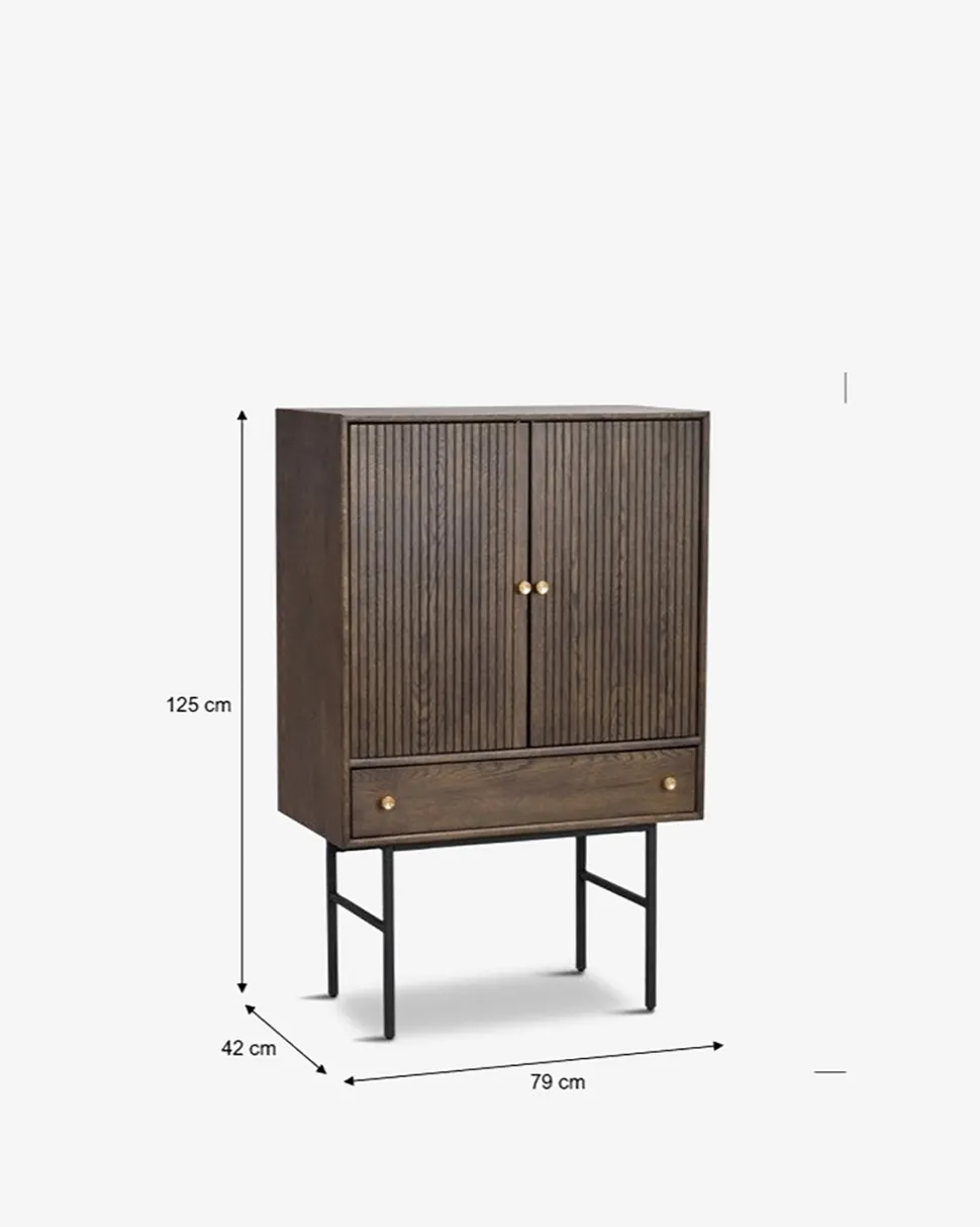 Clearbrook højskænken er udført i lakeret brun eg og med sorte metalben. Højskænken giver god, vertikal opbevaring.