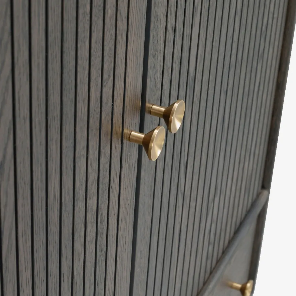Den flotte skænk har en praktisk skuffe i bunden og messingfarvede beslag. Skuffer og låger med blød lukning.