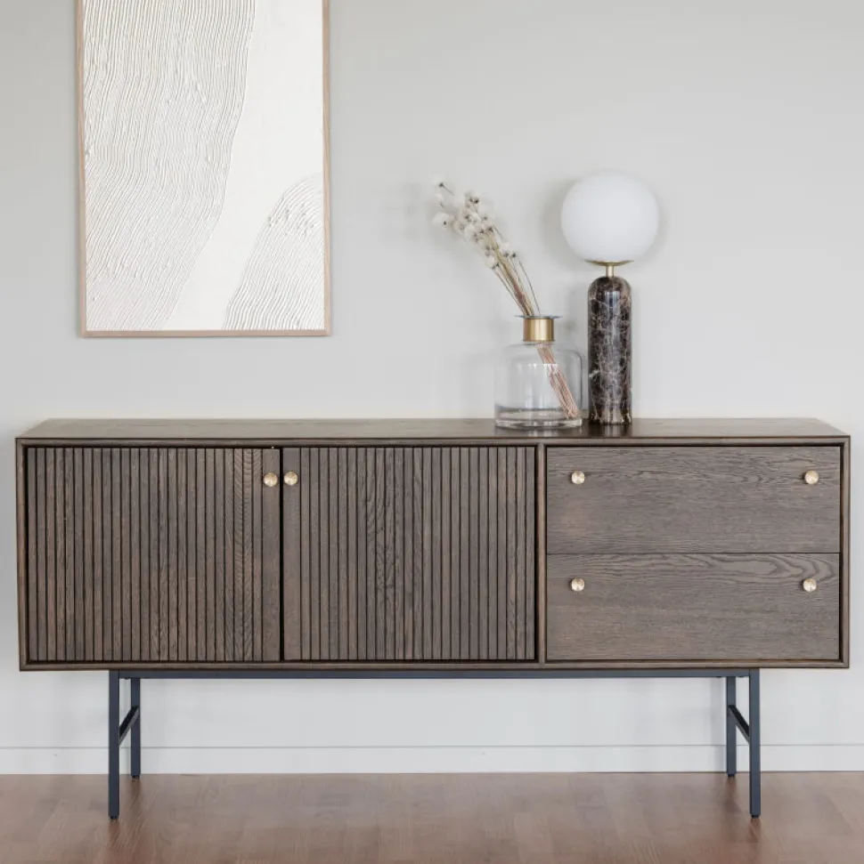 Skænken har praktiske skuffer på den ene side og messingfarvede beslag. Skuffer og låger med blød lukning.