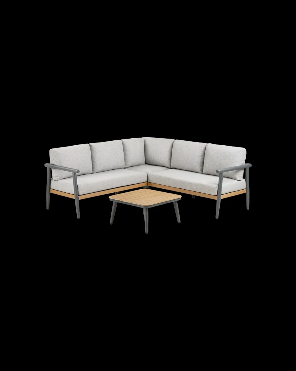 Comillas hjørne loungesæt med rummelig hjørnesofa og sofabord. Robust design med antracit stel, komfortable lysegrå hynder og bordplade i non-wood eg-look.