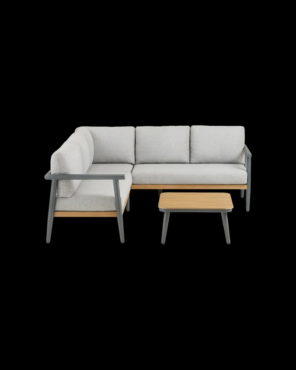 Det medfølgende sofabord har en bordplade i non-wood med eg-look, som tilfører varme og et naturligt element til designet. Sammen skaber materialerne et harmonisk loungesæt, der både er praktisk, holdbart og elegant.