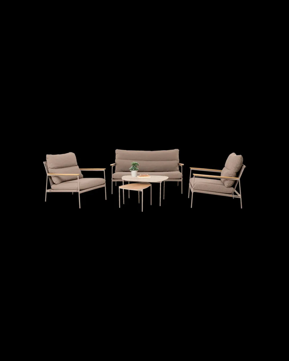 Cosica loungesæt i cremebeige med sofa, 2 lænestole og 2 sofaborde. Moderne loungegruppe med trælook detaljer og høj komfort.