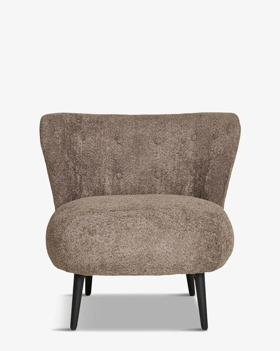 Loungestolen er betrukket med blødt bouclé-stof i en varm brun farve, som giver et indbydende og moderne udtryk.