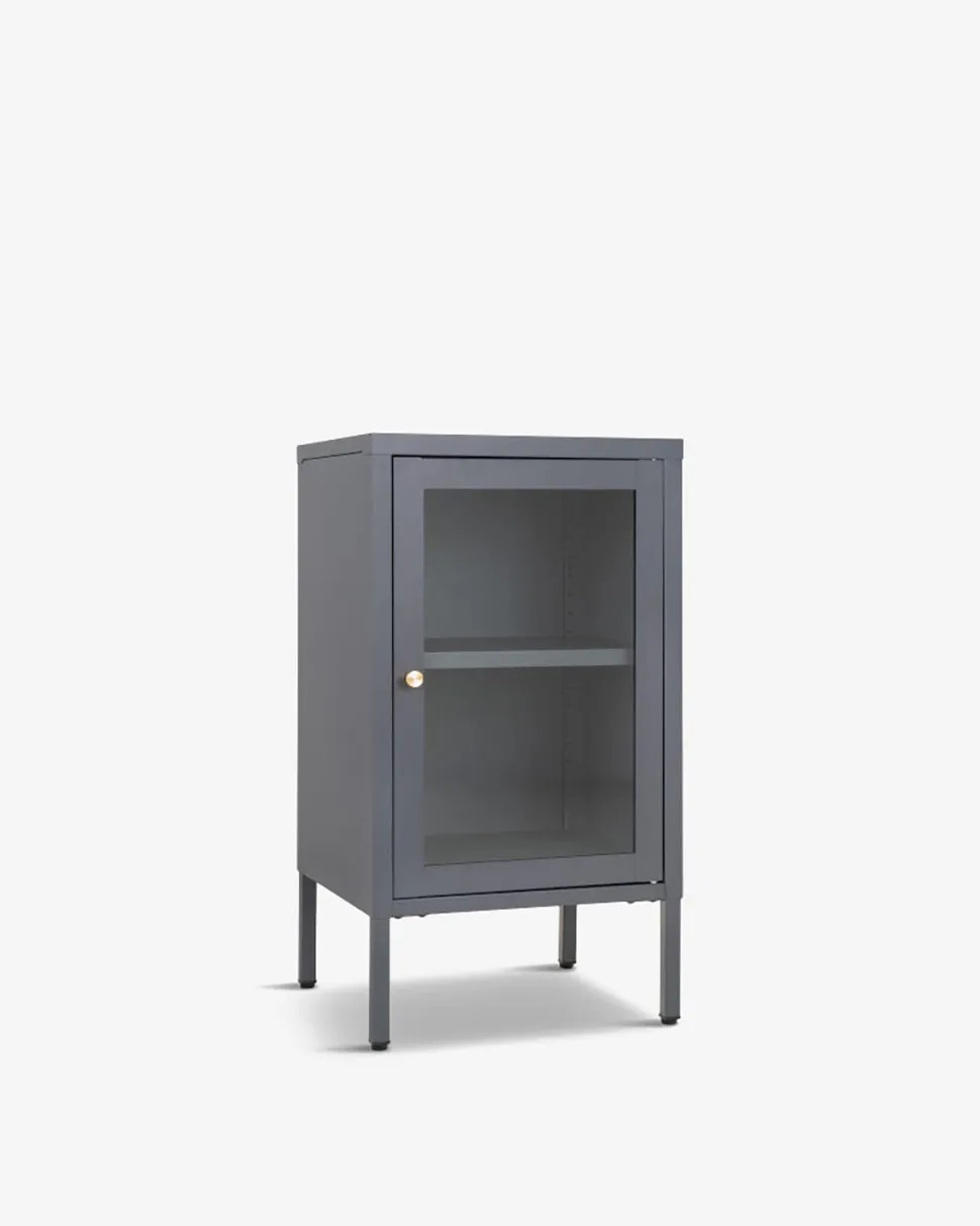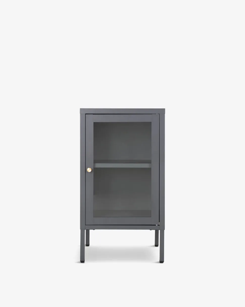 Et stilfuldt og moderne sengebord/lille skænk i flot grå med elegante messinggreb. Perfekt til diskret opbevaring.