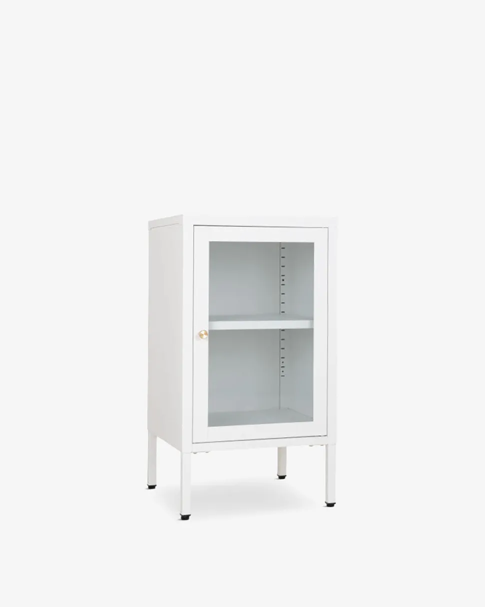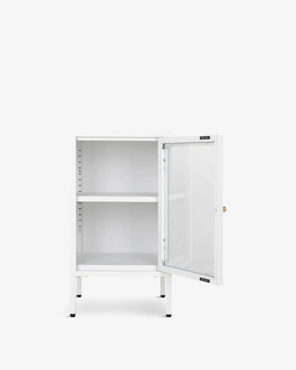 Et stilfuldt og moderne sengebord/lille skænk i hvid med elegante messinggreb. Perfekt til diskret opbevaring.
