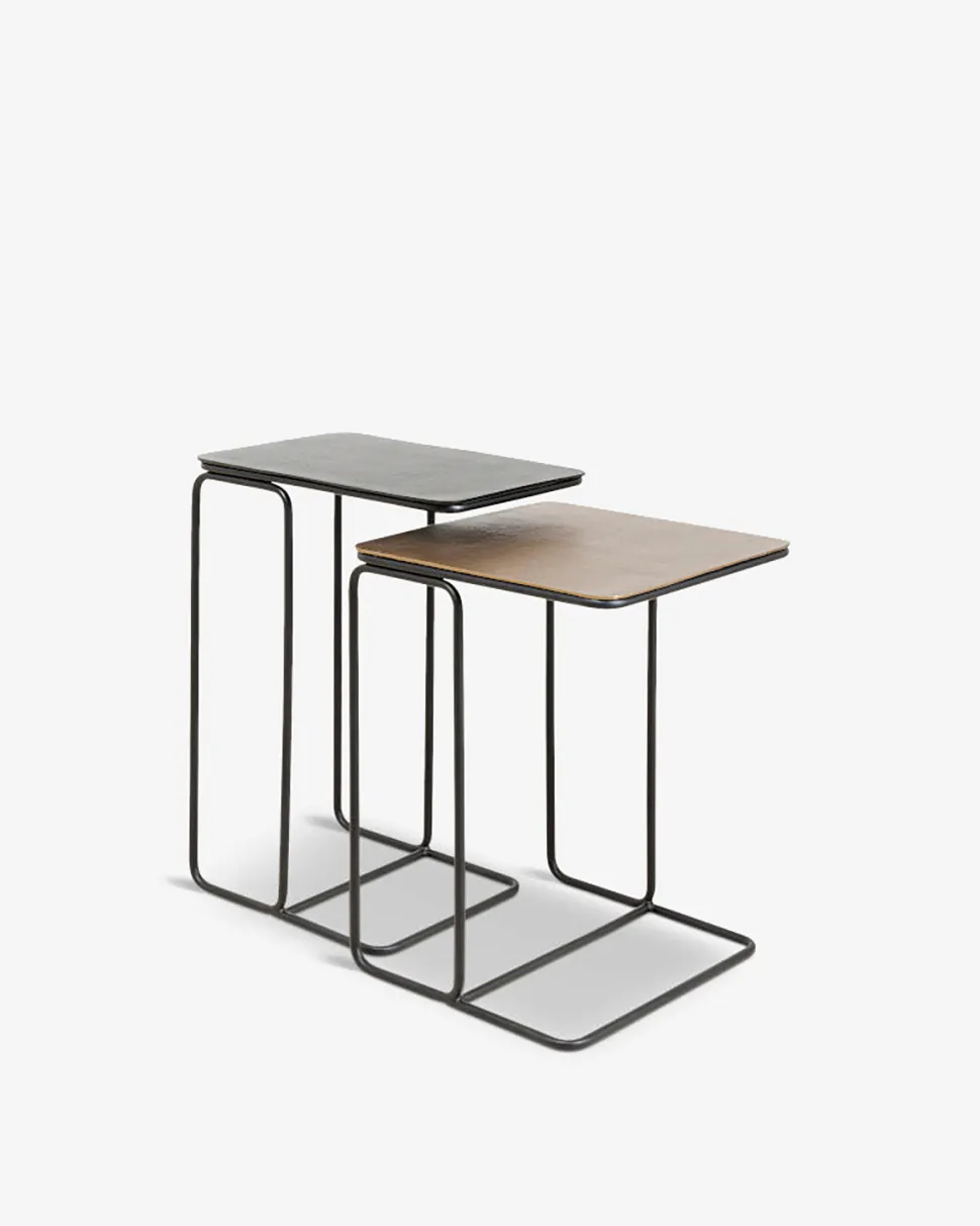 Diego sidebordssættet er stilrent og funktionelt. Bordene er lavet af metal, det ene med bronze belægning og det andet med messingbelægning.