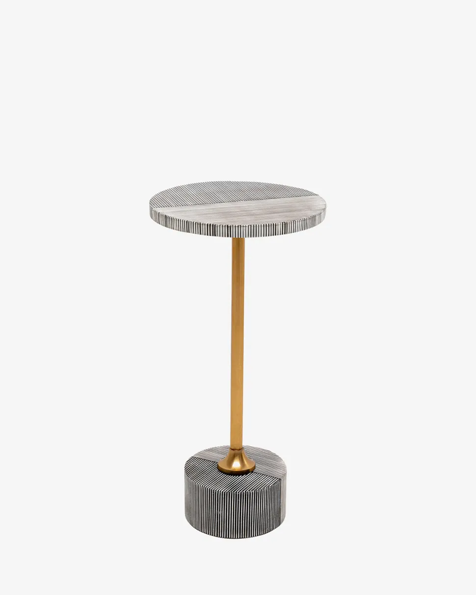 Bordet står på en slank messingstang, som giver et elegant løft og understreger det eksklusive design. Med målene Ø.25 x H.50 cm er det perfekt som sidebord, lampebord eller dekorativ afsætningsplads.