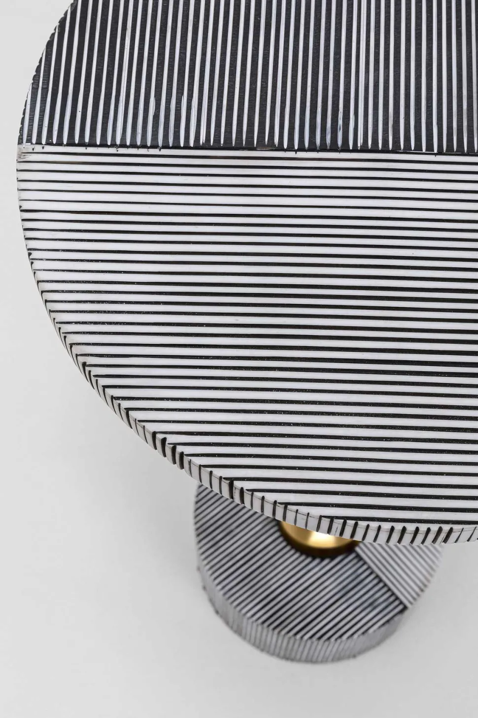 Domero Double sidebordet kombinerer sort og hvidt mangotræ i et markant stribemønster, hvor lodrette og vandrette linjer mødes på midten af bordpladen. Resultatet er et grafisk og moderne udtryk, der tilfører karakter til rummet.