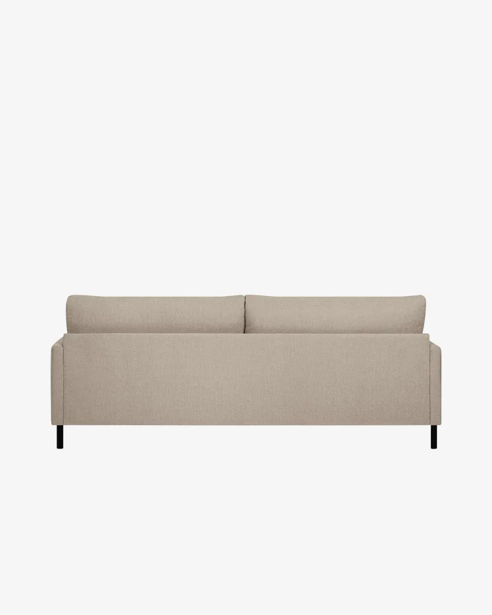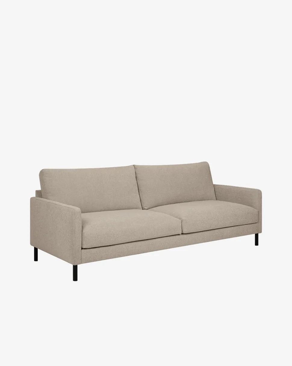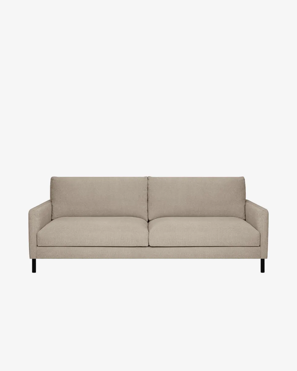Sofaen er polstret med blødt, slidstærkt stof og har rummelige siddepladser, der giver høj komfort for op til tre personer. De faste hynder sikrer god støtte og bevarer formen, selv ved daglig brug. De lige armlæn og den stabile konstruktion giver sofaen et solidt og indbydende udtryk.