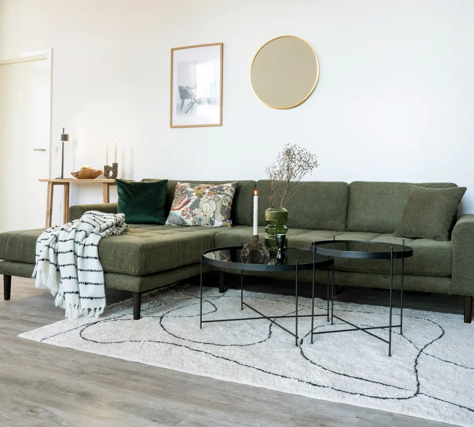 Sofaen har en dejlig stor, bred chaiselong, så man nemt kan sidde 2 sammen og flette fingre. Hynderne er fyldt med skum, der giver en lækker komfort og lokker til at blive flydende. Der medfølger fire pyntepuder.