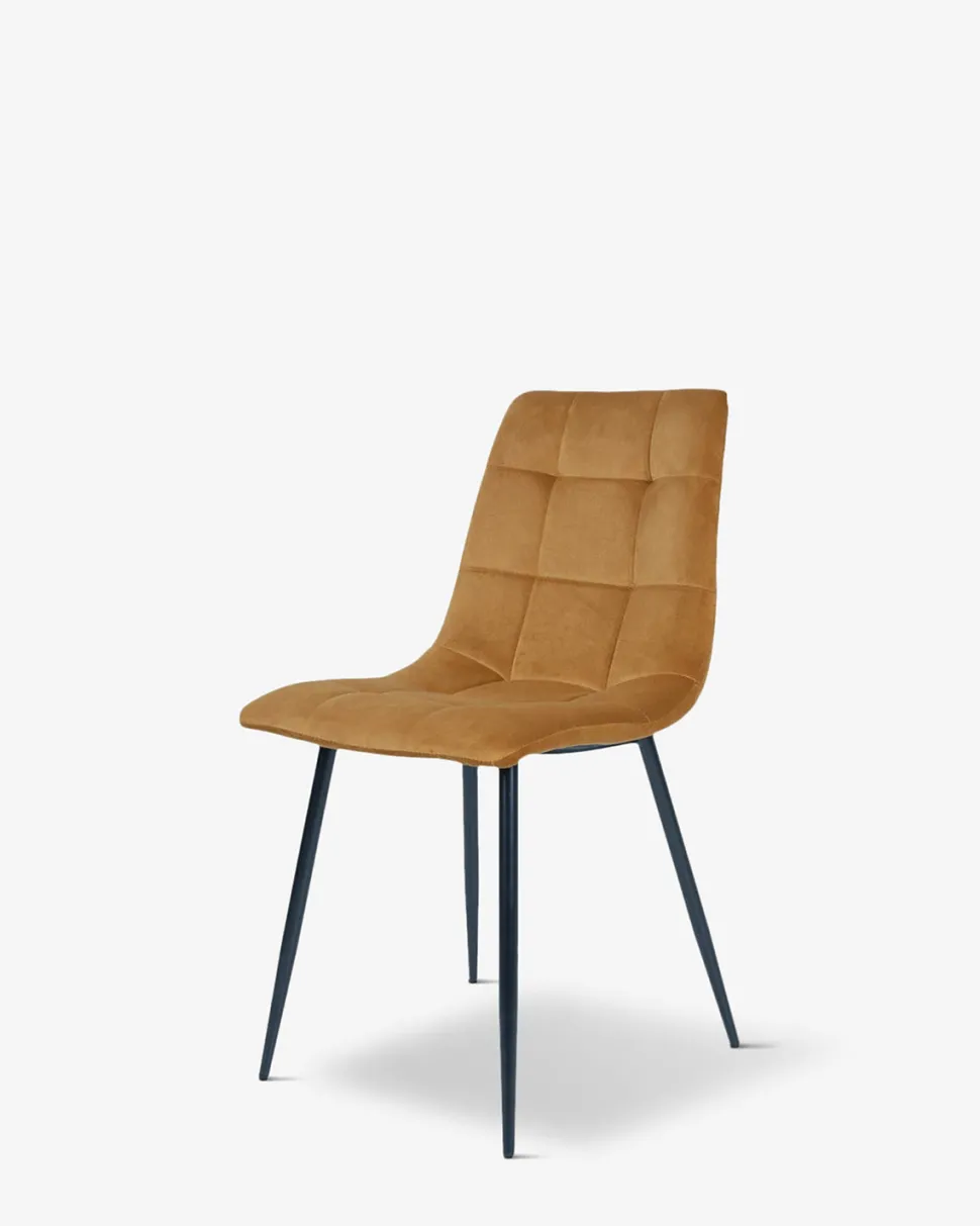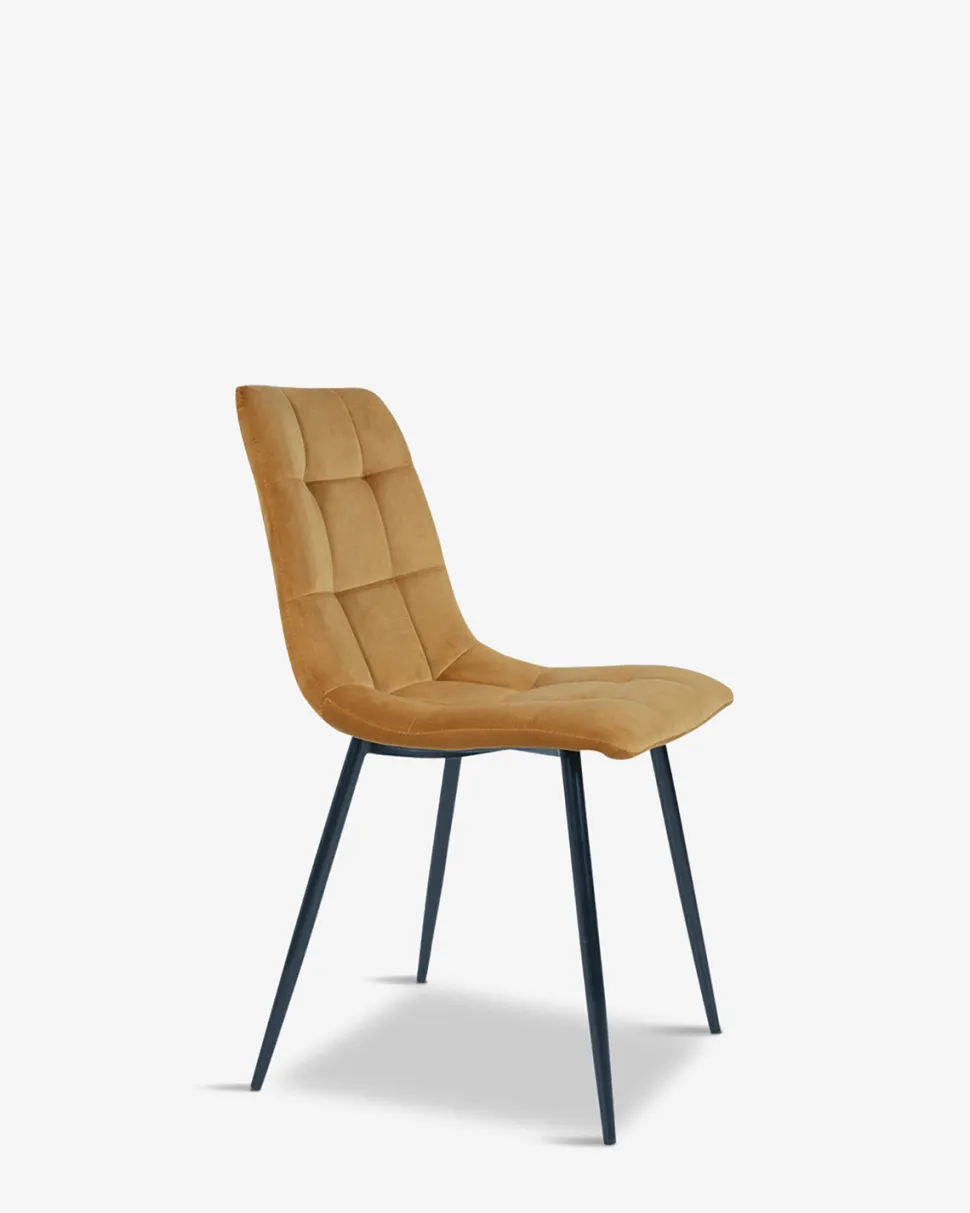 Spisebordsstol i en lækker guld/sennepsfarvet velour, og med en fantastisk sidde komfort på grund af det polstrede sæde og ryg.