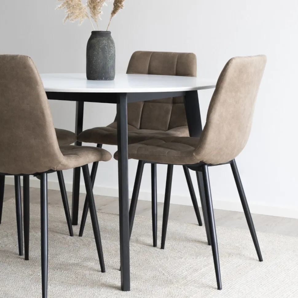 Frigg Spisebordsstol er her i en lækker lys brun mikrofiber. Den er både komfortabel og indbydende.