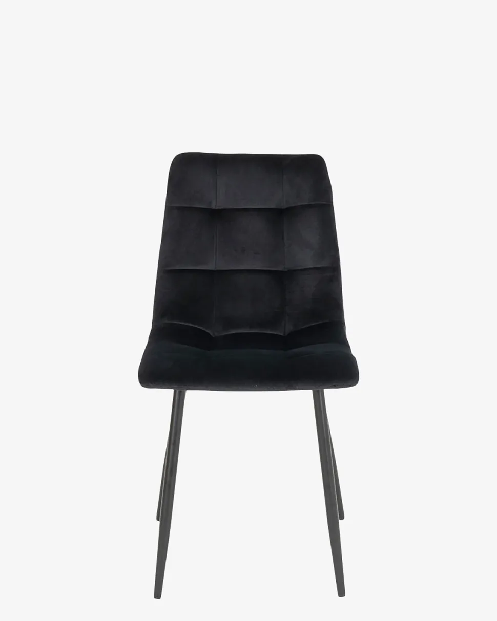 Frigg spisebordsstol i en elegant sort velour, og med en fantastisk sidde komfort på grund af det polstrede sæde og ryg.