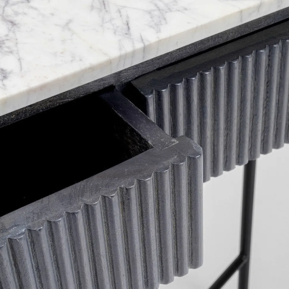 Elegant Glenn konsolbord i mangotræ med hvid marmortop, der vil stå i din stue som en smuk og samtidig praktisk detalje i rummet.