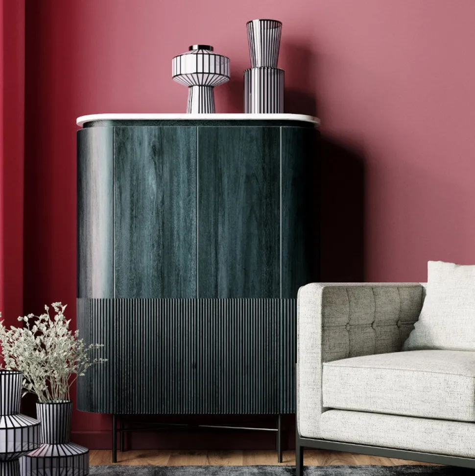 Det høje, flotte Glenn vitrineskab er et meget dekorativt møbel i sort mangotræ og med hvide marmor-detaljer.