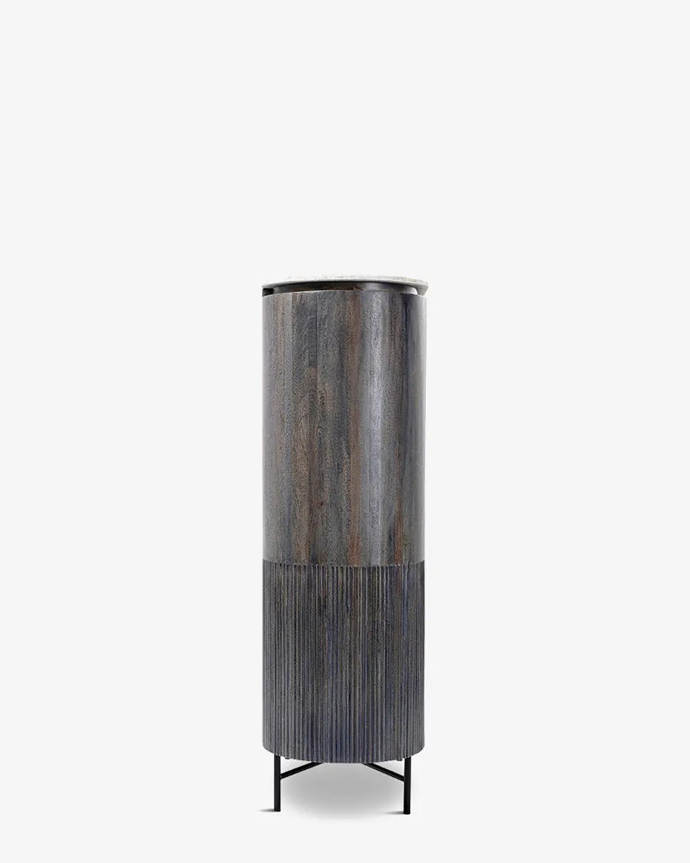 Det høje flotte Glenn vitrineskab er et meget dekorativt vitrineskab i sort mango træ og hvid marmor top med sorte ben.