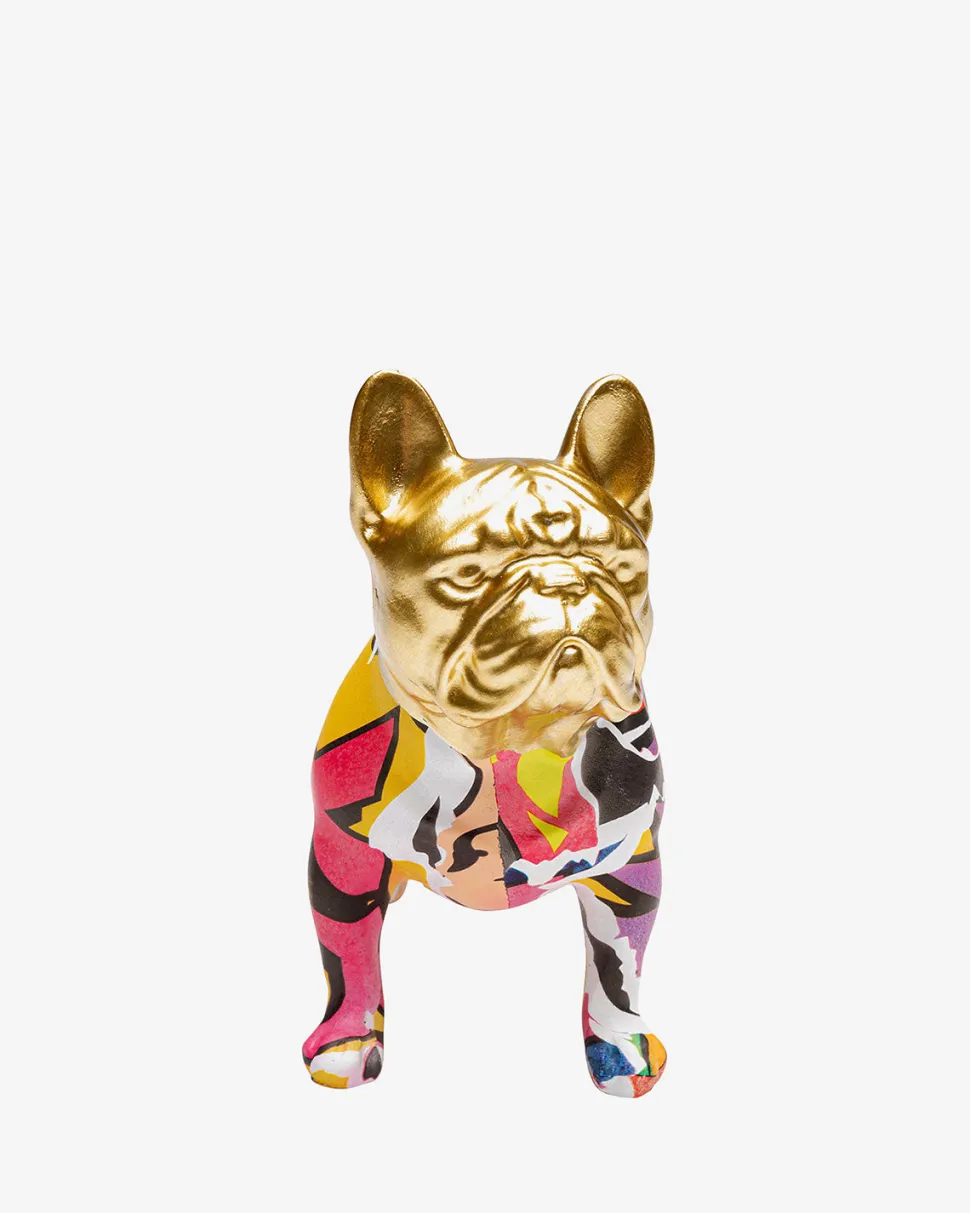 +Skinnende guld og klare, varme farver gør den dekorative hund til et moderne blikfang.