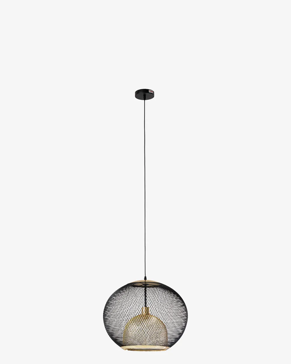 Grato pendel er en moderne og trendy loftslampe lavet af trådnet i sort og guld. Den bløde, industrielle stil giver et varmt udtryk.