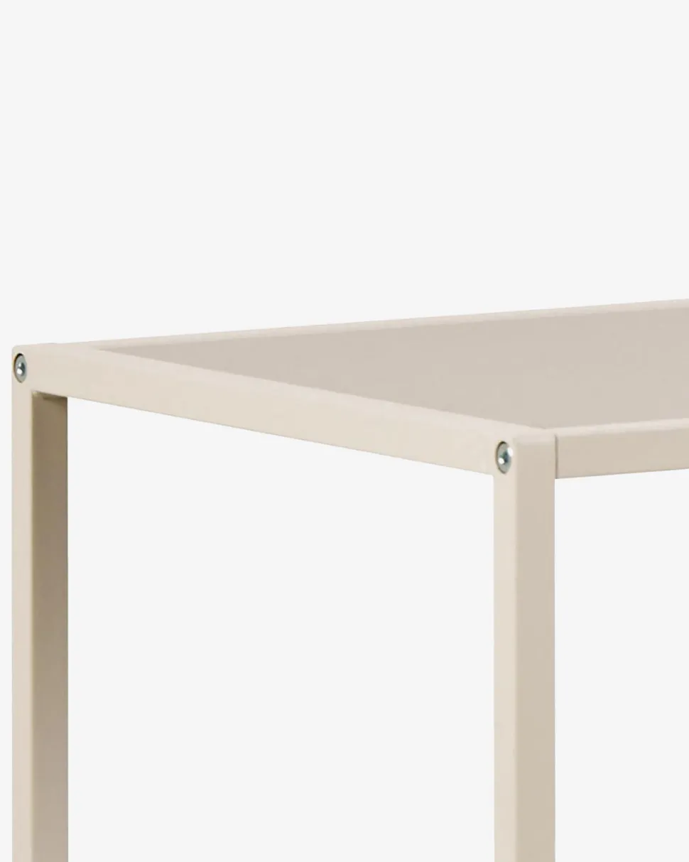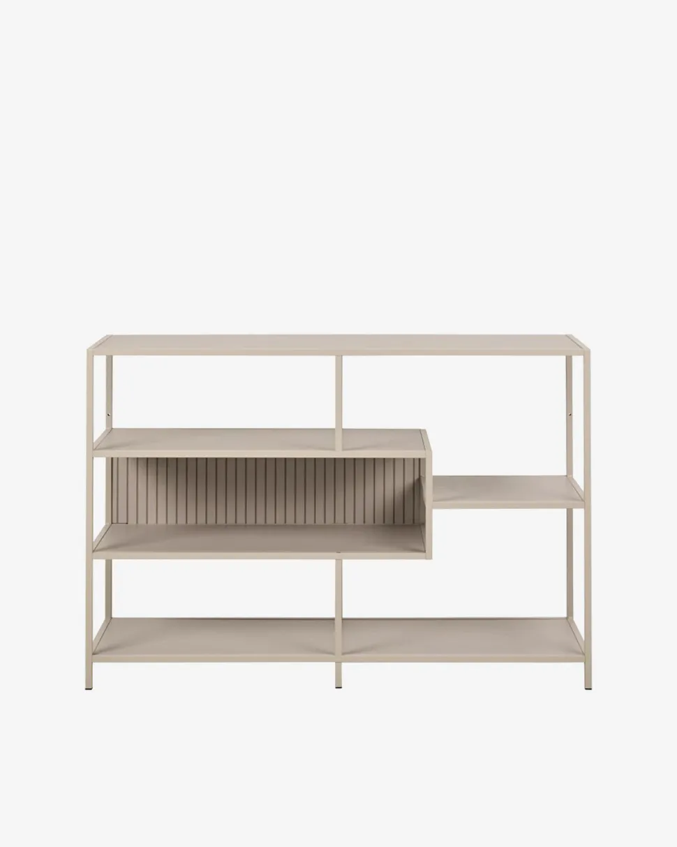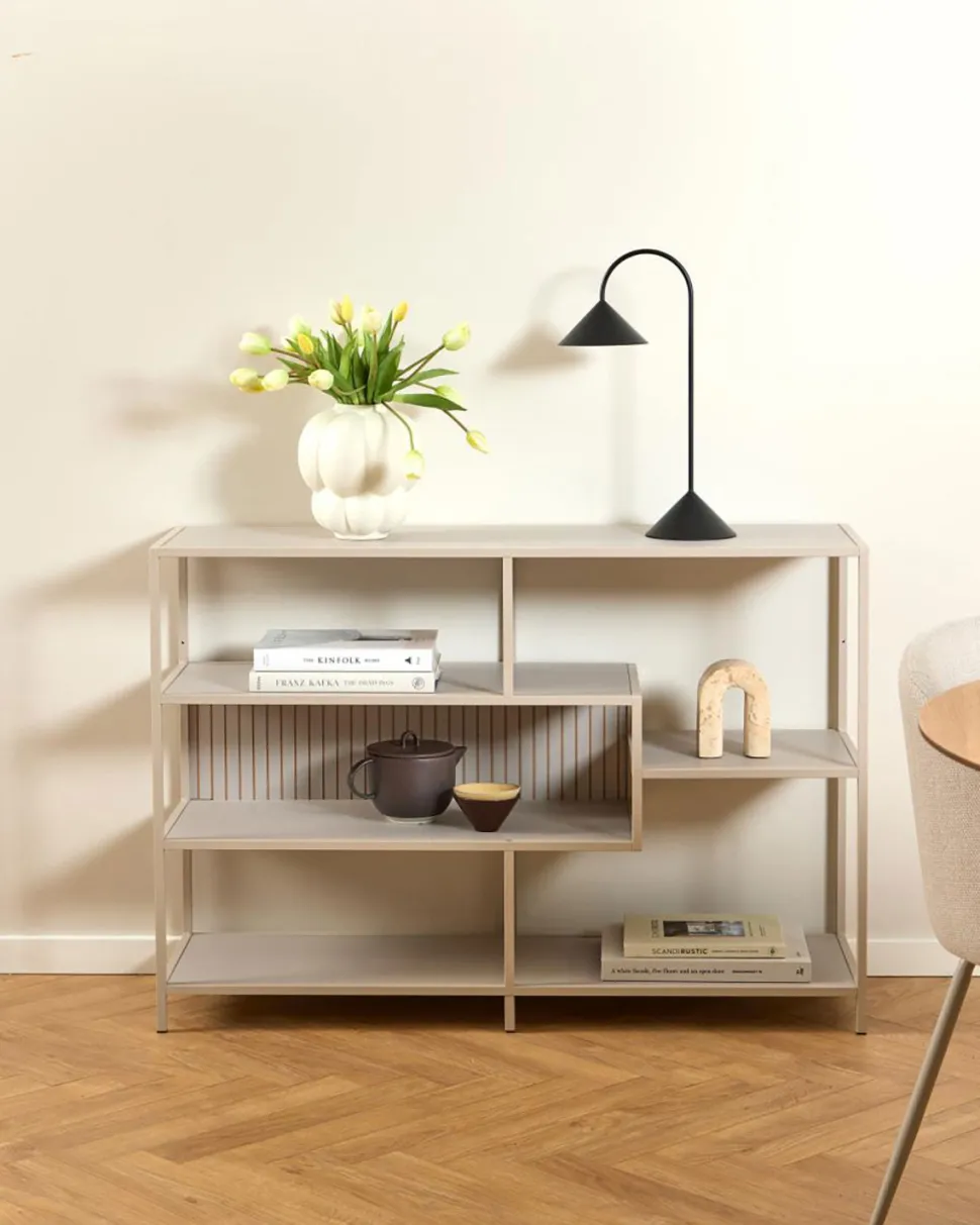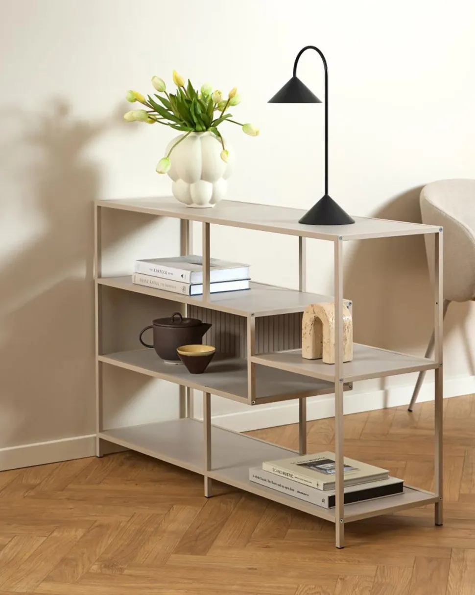 Den lave højde gør reolen velegnet til både stue, kontor eller entré, hvor den kan bruges til bøger, dekorationer eller praktisk opbevaring. Den greige farve giver et roligt og tidløst udtryk, som passer ind i mange forskellige indretninger.