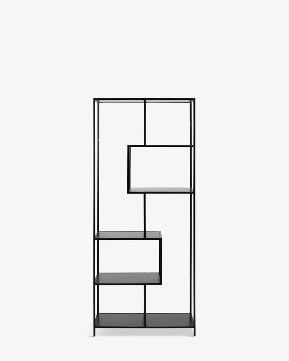 Høj reol i meget dekorativt og stilrent design. Hylderne er udført i sortmalet ask og stellet er sortmalet metal, hvilket giver et smukt og moderne look.