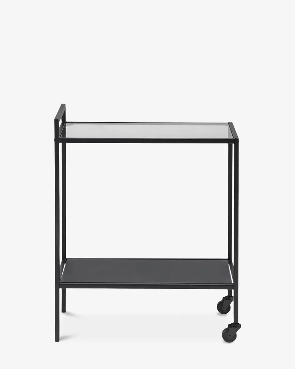 Fint rullebord på hjul som kan gøre det ud som det perfekte barbord. Bordet er udført i sort lakeret metal, med glas hylde.