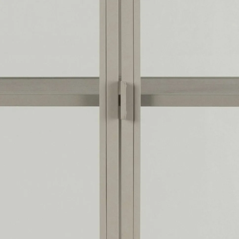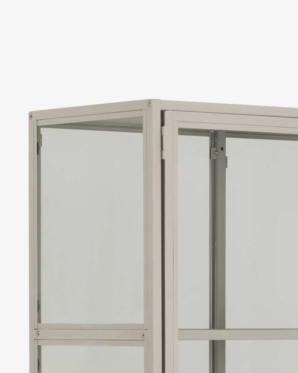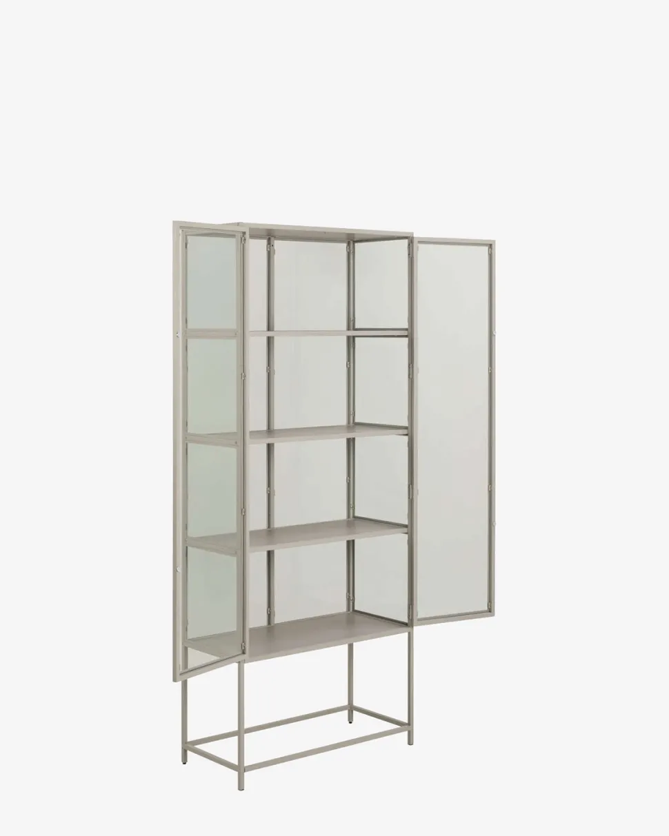 Gwenn vitrineskabet kombinerer funktionel opbevaring med et let og stilrent design. Skabet er udført i grålakeret metal med glaslåger og glaspaneler i siderne, som giver et åbent og luftigt udtryk – perfekt til at fremhæve dine yndlingsgenstande, porcelæn eller bøger.