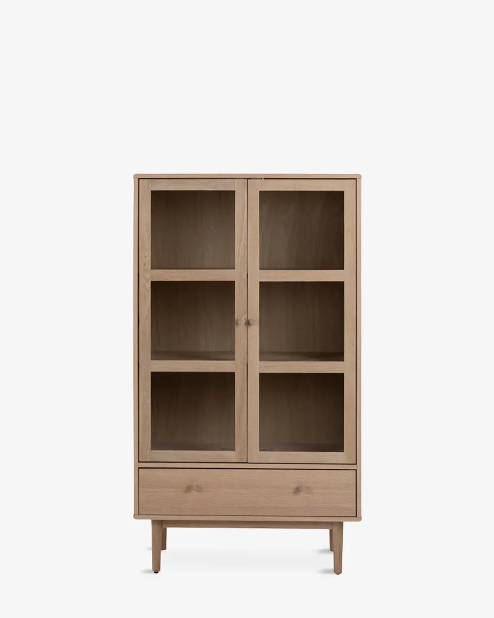 Hefe vitirneskabet har to glaslåger, tre hylder og en stor skuffe nederst med god plads til opbevaring.