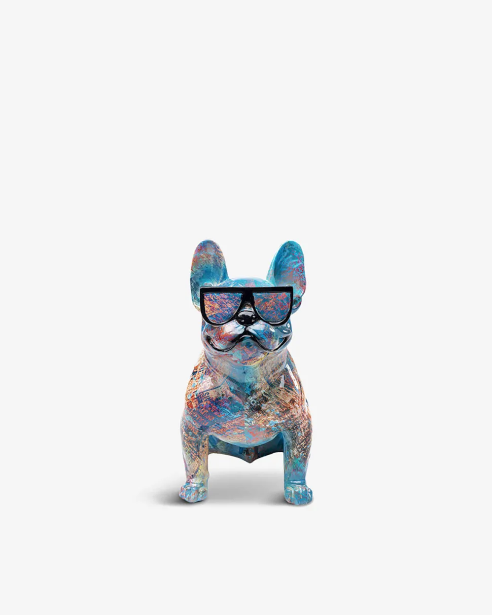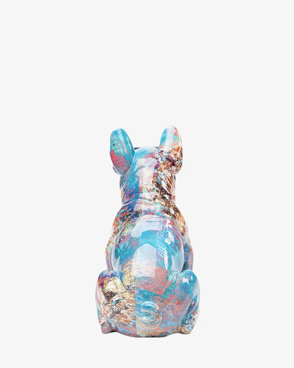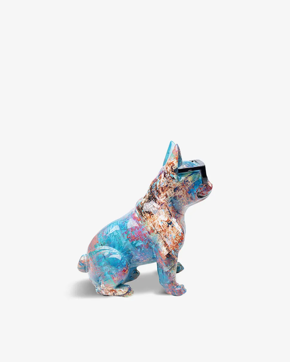 Siddende hundefigur med farverigt maling, som gør en dekorativ skulptur til et fedt lille kunstværk.