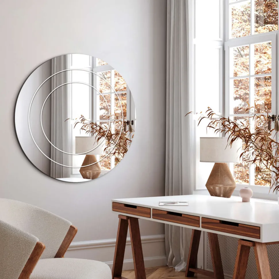 In the Circle spejlet kombinerer funktion med grafisk finesse. De indlagte cirkler i glasset er facetslebne og skaber et smukt spil, når lyset rammer overfladen. Et dekorativt element, der giver spejlet dybde og karakter.