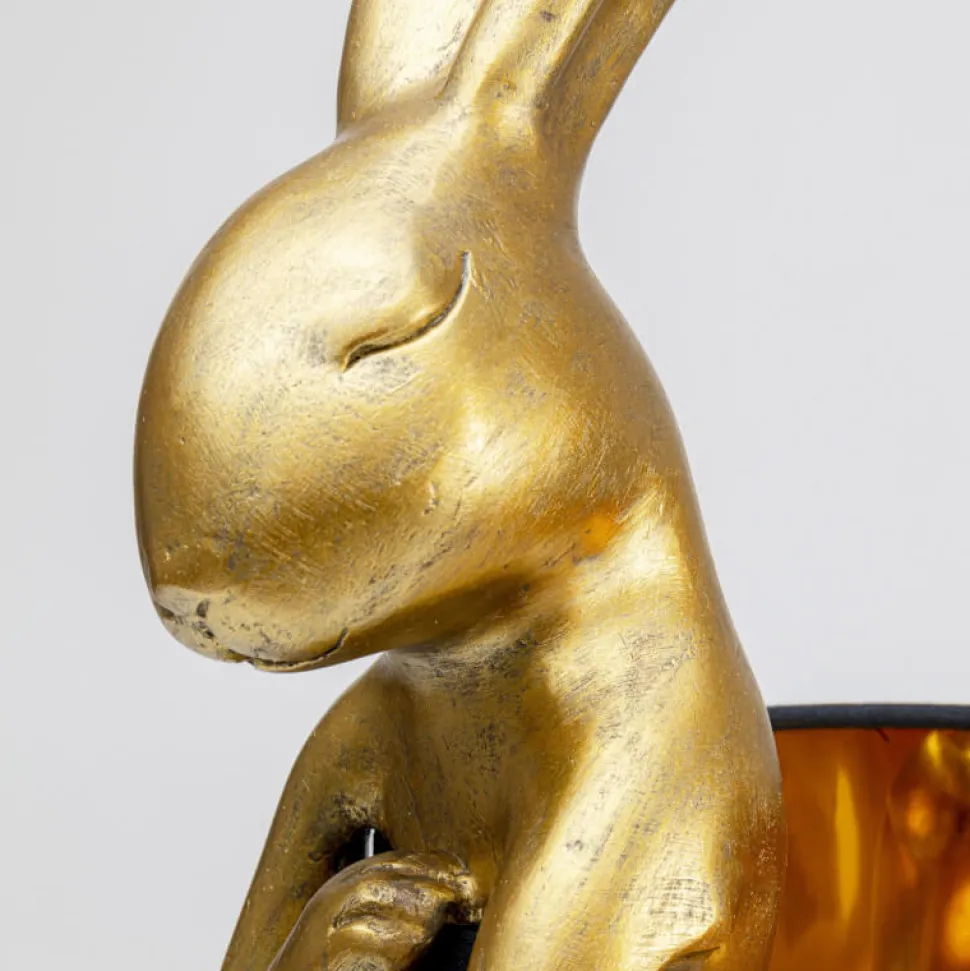 Charmerende lampe med den søde gyldne kanin, der støtter lampeskærmen. Dette unikke design er perfekt til et dekorativt indslag.