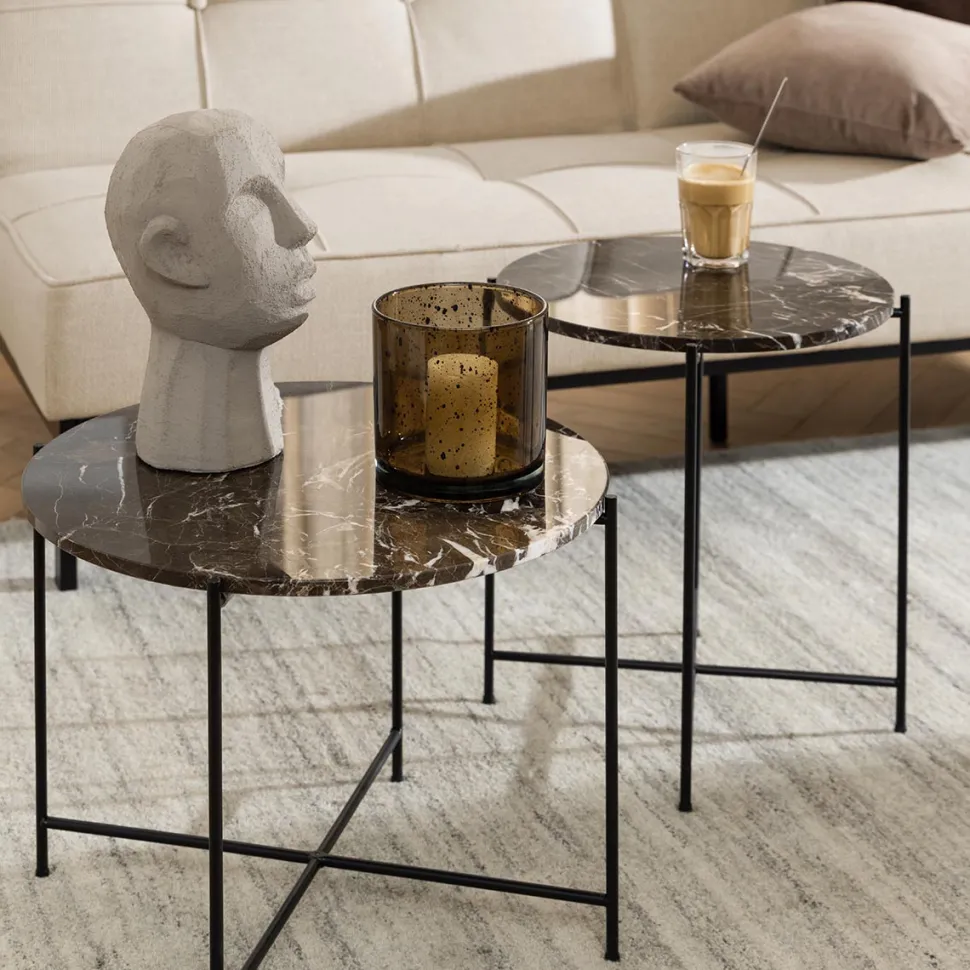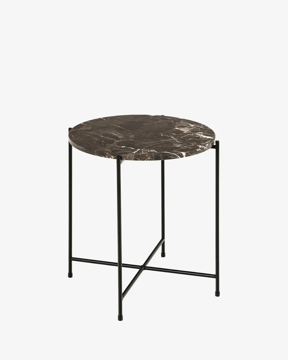 Light sidebordet i brun marmor tilfører varme og eksklusivitet til indretningen. Den runde bordplade i brun marmor med naturligt farvespil giver et elegant og levende udtryk, mens det sorte metalstel skaber en moderne kontrast.