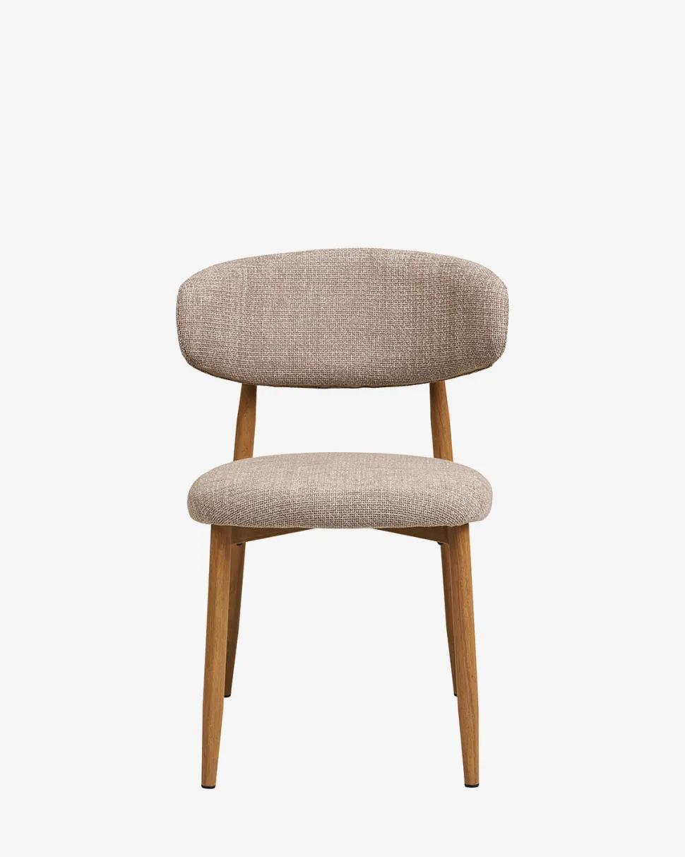 Det polstrede sæde og ryglæn er betrukket med et blødt, sandfarvet tekstil, som tilfører en behagelig siddeoplevelse og et harmonisk, moderne udtryk. Kombinationen af de afrundede former og de slanke ben gør stolen ideel til både moderne og klassiske spiseområder.