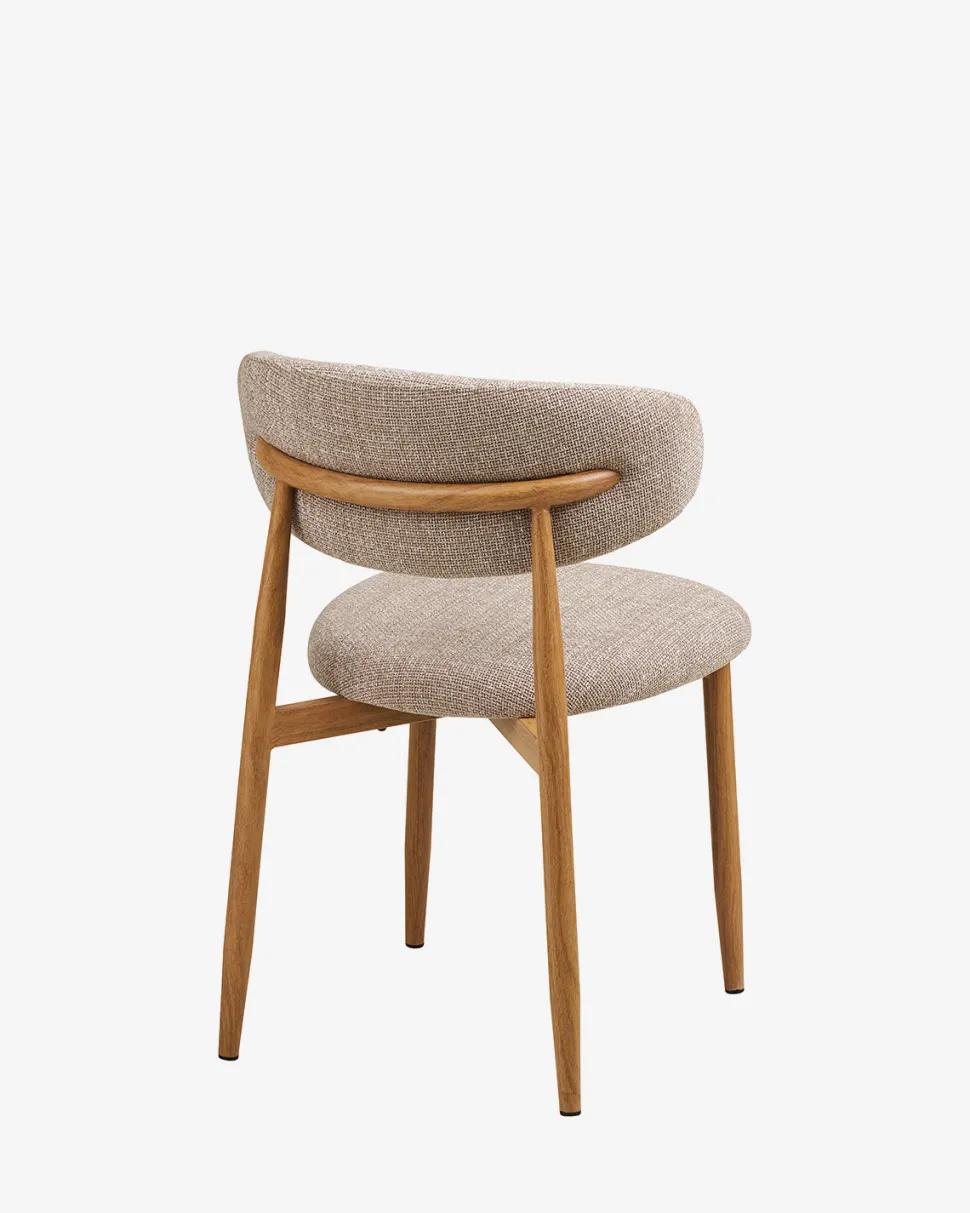Denne stilrene spisebordsstol forener komfort og funktionalitet i et elegant, nordisk design. Stolen har et robust metalstel med flot eg trælook, der giver udtrykket varme og naturlighed – samtidig med, at konstruktionen er let og holdbar.