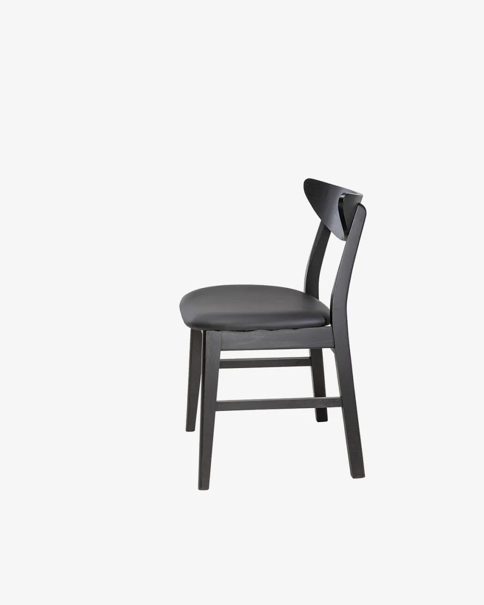 Liva spisebordsstol – let og klassisk design. Sort træstel og polstret sæde i sort læder for komfortabel hverdagsbrug.