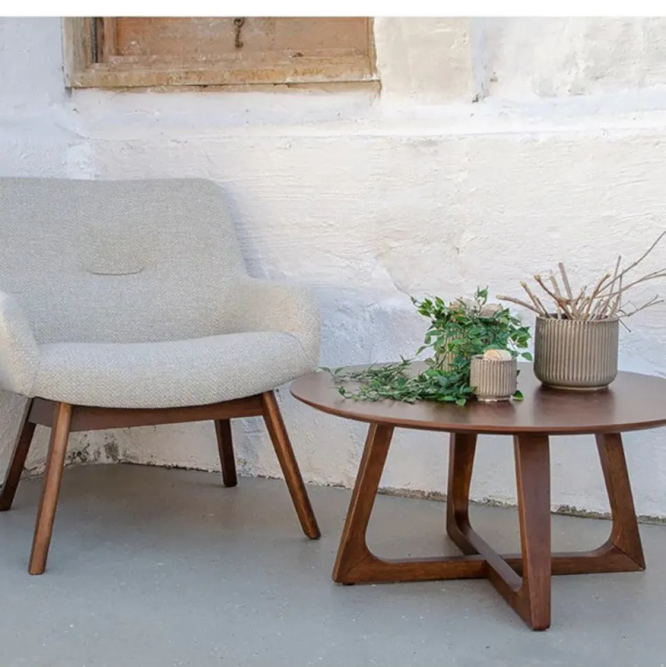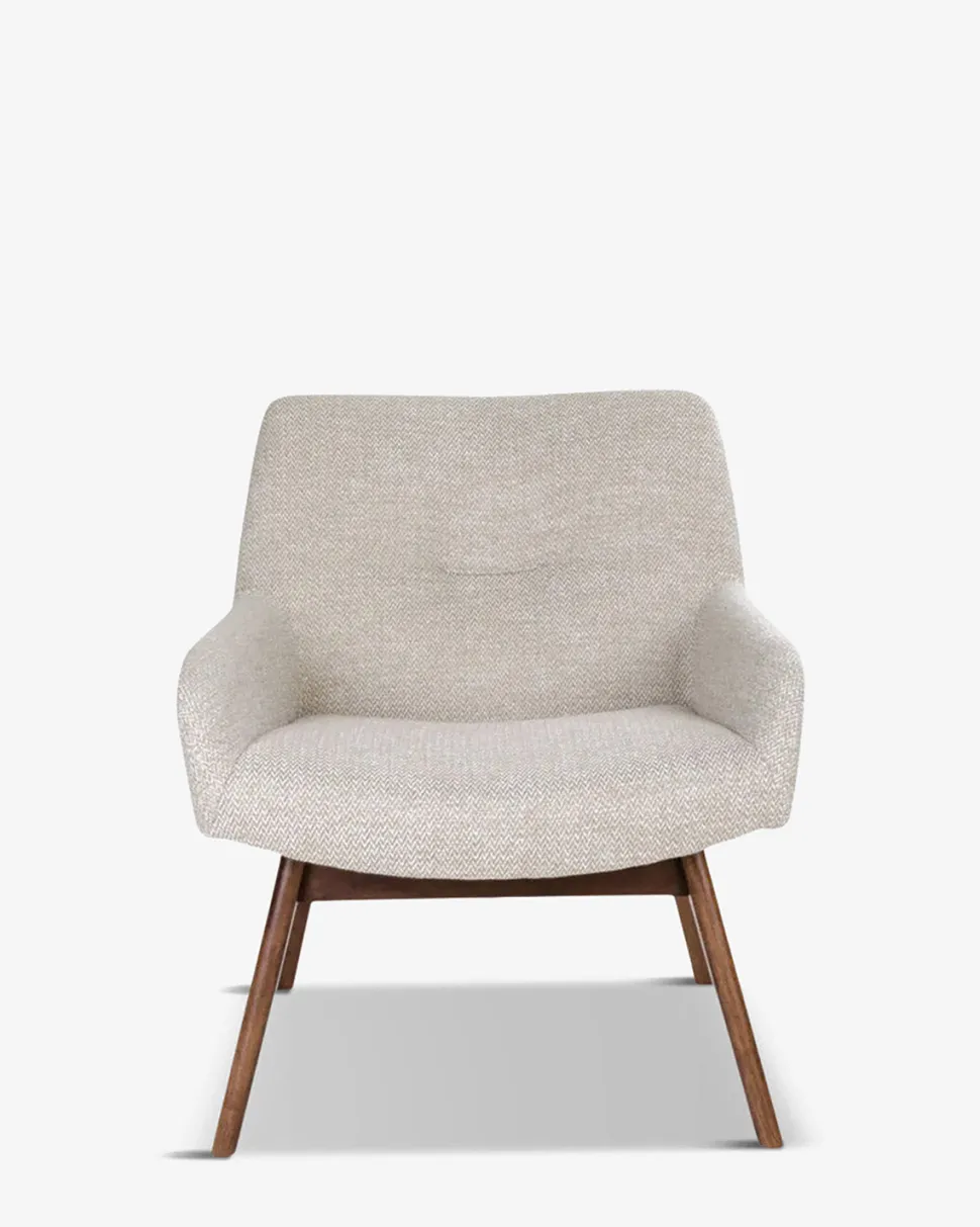 En loungestol i sandfarvet stof med valnødfarvede træben vil være et stilfuldt og moderne valg.