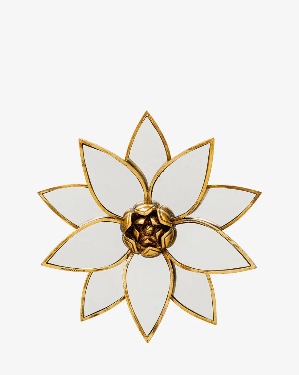 Lotus Vægspejl – dekorativt design med gylden glød. Lotus vægspejlet er formet som en lotusblomst og skaber et elegant blikfang.