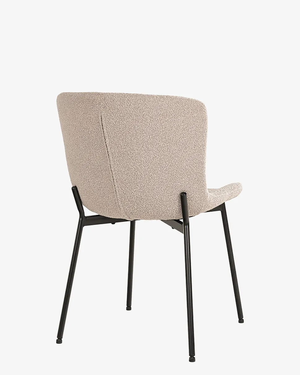 Maceda er en elegant spisebordsstol i beige bouclé stof. Maceda er en elegant, stilren og komfortabel stol.